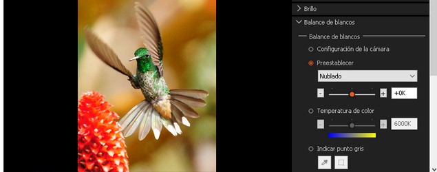 Luz día / Sombra / Nublado / Flash. También está el cuentagotas de equilibrio de blancos, a fin de seleccionar una zona con tonos neutros y que nos sirva de guía.
