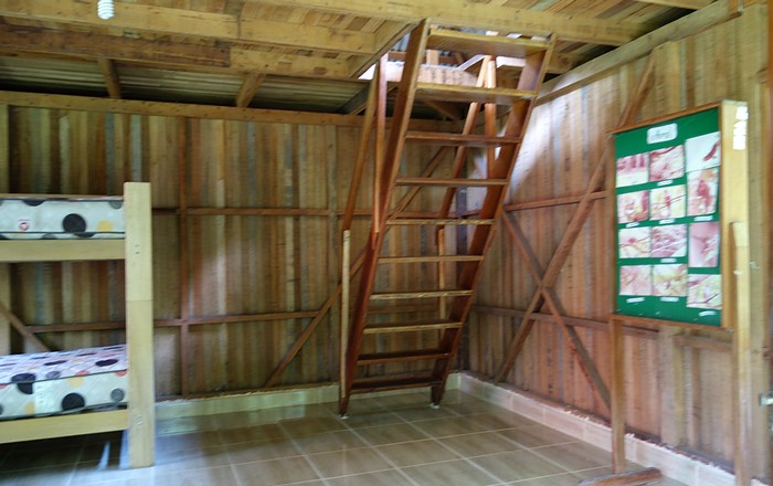 Para los visitantes, dispone de una cabaña de dos pisos, con camarotes. En el primer piso existen 4 camas y en el segundo un área para bolsas de dormir. Adicionalmente hay una amplia plataforma techada que sirve para acampar.