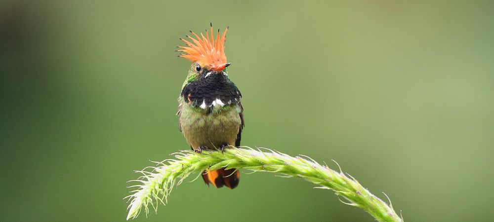 Rufous-crested Coquette, Wire-crested Thorntail, Gould's Jewelfront, Long-billed Starthroat. De acuerdo a la fecha de la floración de heliconia, también puede